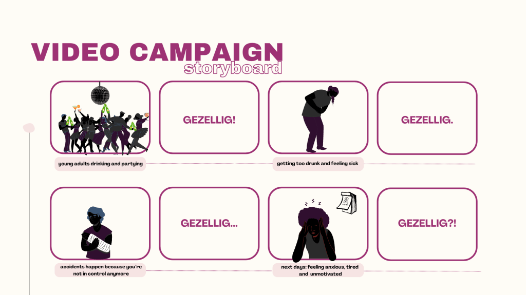 This research was conducted to create a campaign proposal against binge drinking among young adults. In the Netherlands, young adults experience various physical and mental health problems resulting from binge drinking. Five interviews were conducted to get more insights into why young adults binge drink and which resistance strategies they use. The results showed that the main reason why participants binge drink is because it is “gezellig”. The resistance strategies that the participants mostly used were social validation, assertion of confidence / self-assertion, and attitude bolstering, which are all empowering resistance strategies. Based on these results, several persuasion strategies were selected to neutralize resistance, namely reverse psychology, self-persuasion, and humor. This resulted in a video campaign explaining why binge drinking is actually not “gezellig”, by showing situations that may occur when people binge drink that become progressively more serious. The video ends with the recommendation: “Keep it gezellig, met ‘n drankje minder”. The purpose of this campaign is to reduce alcohol consumption by using humor to attract attention to the campaign and reverse psychology and self-persuasion to persuade young adults to change their binge drinking behavior.